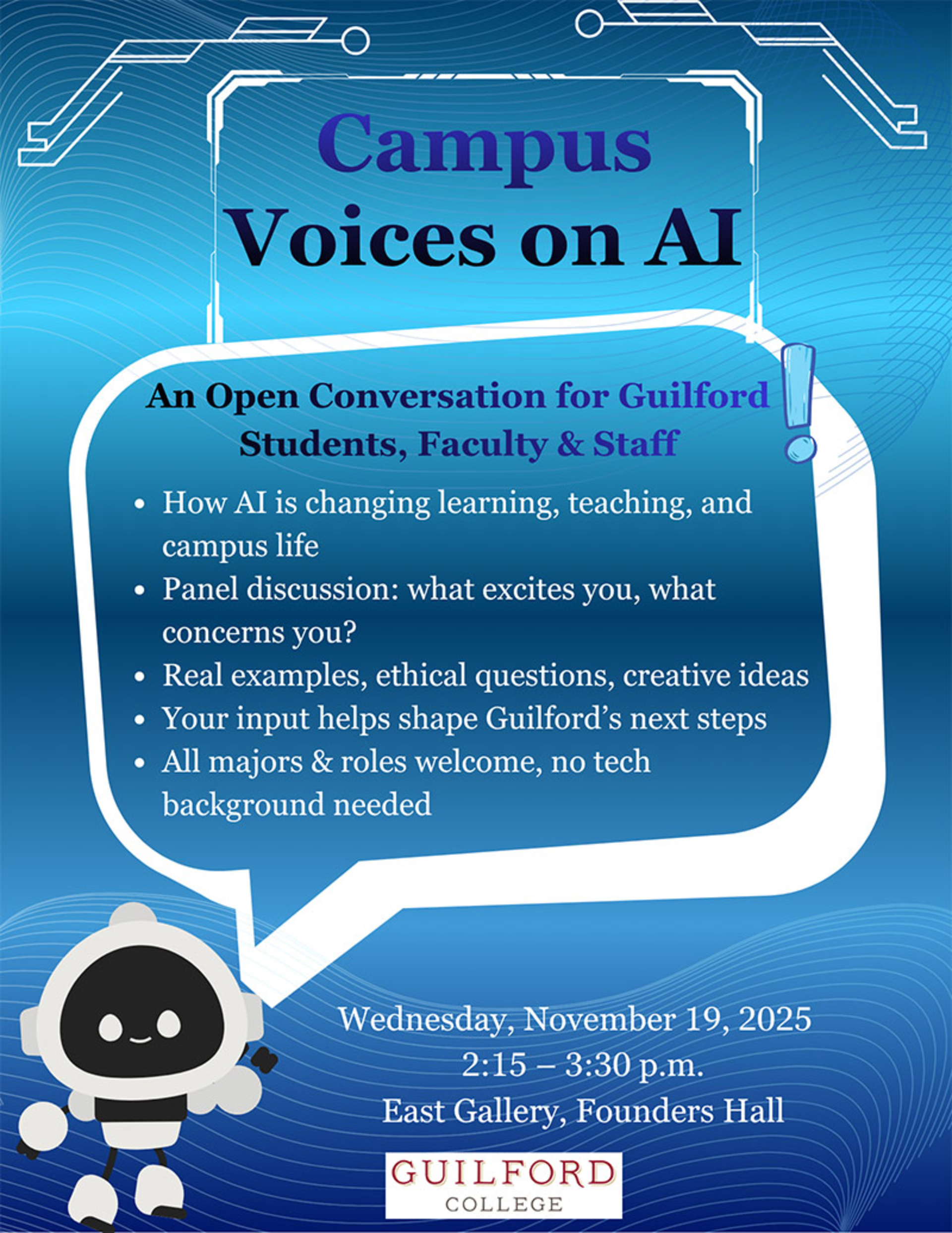 Join us for Campus Voices on AI, an open conversation where Guilford students, faculty, and staff share their perspectives on how artificial intelligence is shaping the way we learn, teach, and connect.