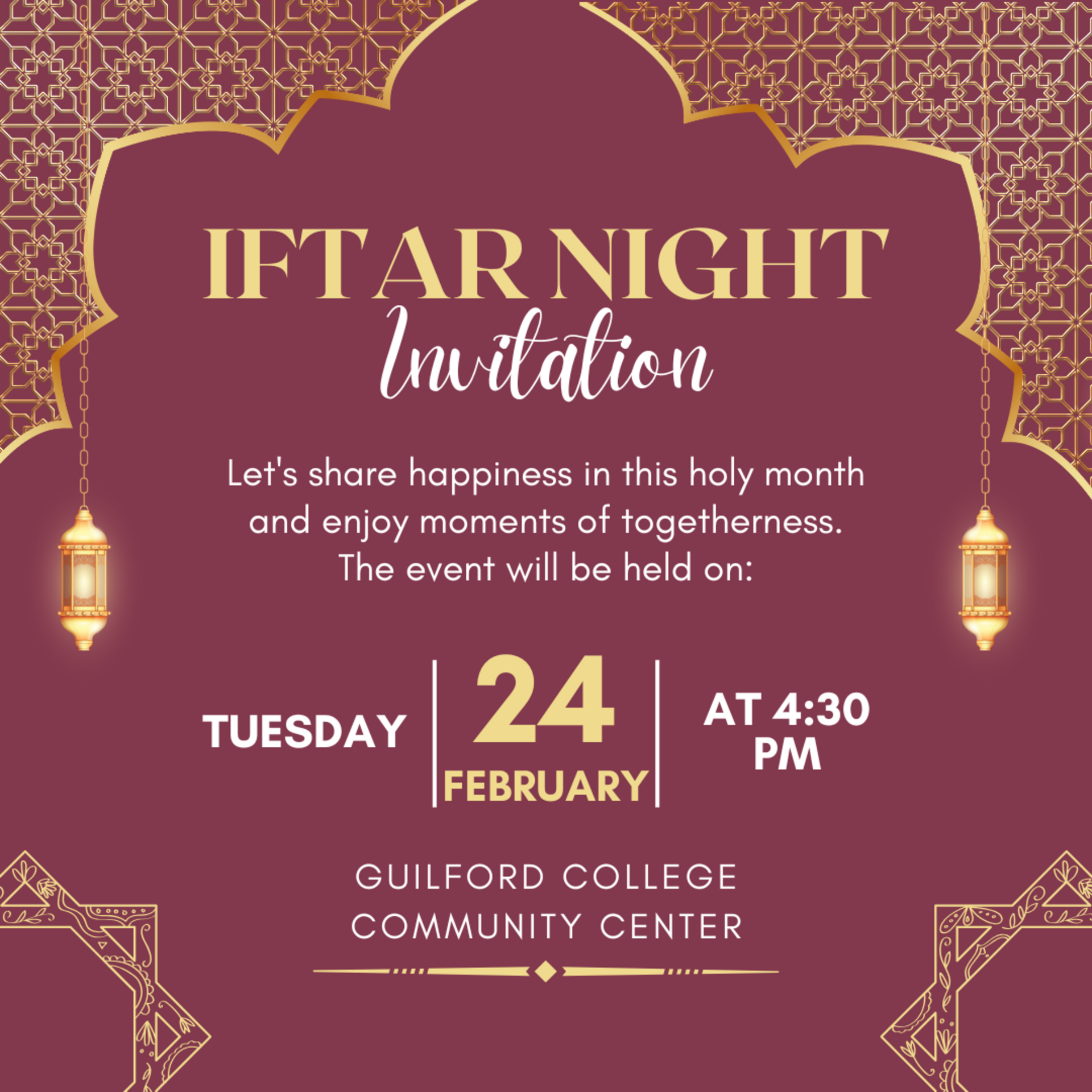 The Muslim Student Association will host an Iftar on February 24th at 4:30 p.m. This gathering is open to everyone, whether you observe Ramadan or simply wish to learn, connect, and share in fellowship.