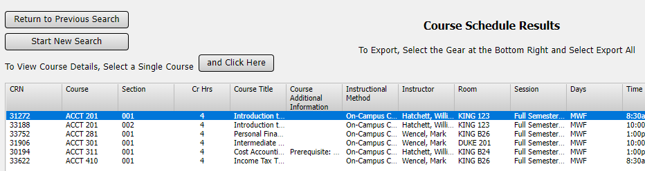 Selecting Search Course Schedule on the dashboard will display courses meeting your search criteria.
