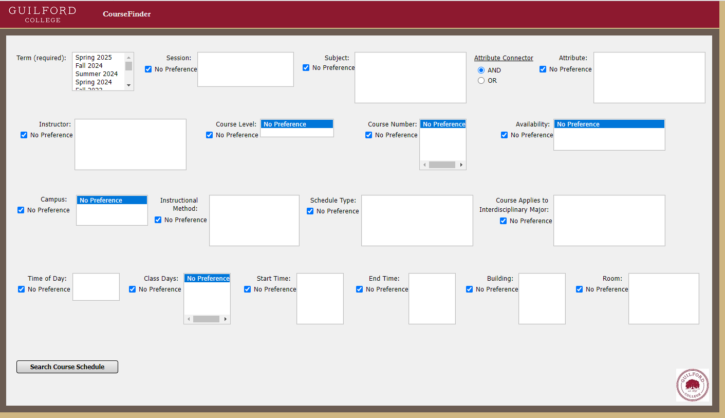 • by default only courses set to display on Banner Web are searched by CourseFinder, click the Guilford tree emblem in the lower right corner to view courses not displayed on Banner web (e.g., many independent studies)