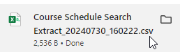 Currently there is a known bug in which displaying results to a dashboard and then exporting data with the gear icon results in broken records (extra lines) for courses with two meeting locations or day/time schedules. Evisions (Argos vendor) is working on a solution. The Course Schedule Search Extract report avoids this problem by including multiple location and/or schedule values in the same cell to deliver only one row per course section in the export.