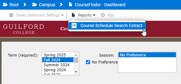 For CourseFinder, the Course Schedule Search Extract report rather than dashboard display should be used in two specific scenarios due to limitations of the dashboard display and dashboard export.