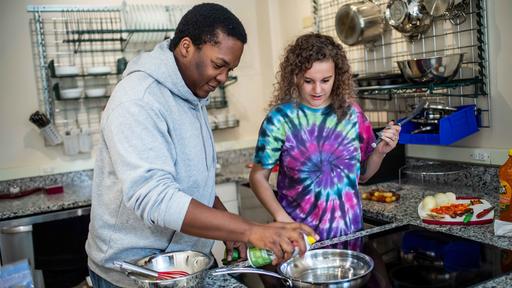 3. Binford’s lower level includes a full, modern demonstration kitchen and sunlit dining area. Students can gather to cook and eat meals, watch cooking demonstrations, and attend cooking classes.