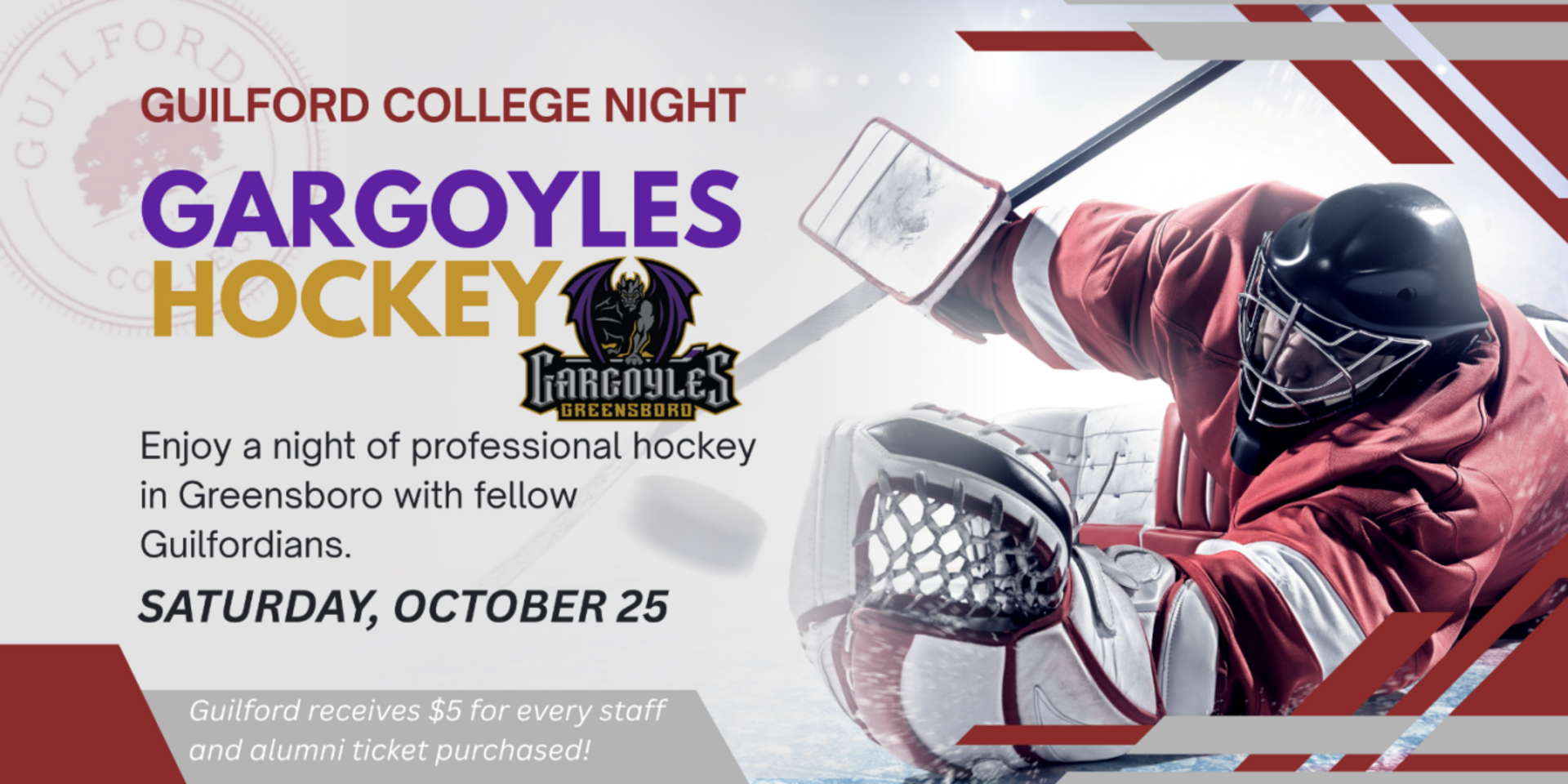 Guilfordians are invited to hit the ice – as fans, that is – for Guilford College Night with the Greensboro Gargoyles! It’s a night of fun, fellowship and hometown hockey as the Gargoyles, in their inaugural season, take on the Reading (Pa.) Royals. It’s also a chance to raise some money for the College.