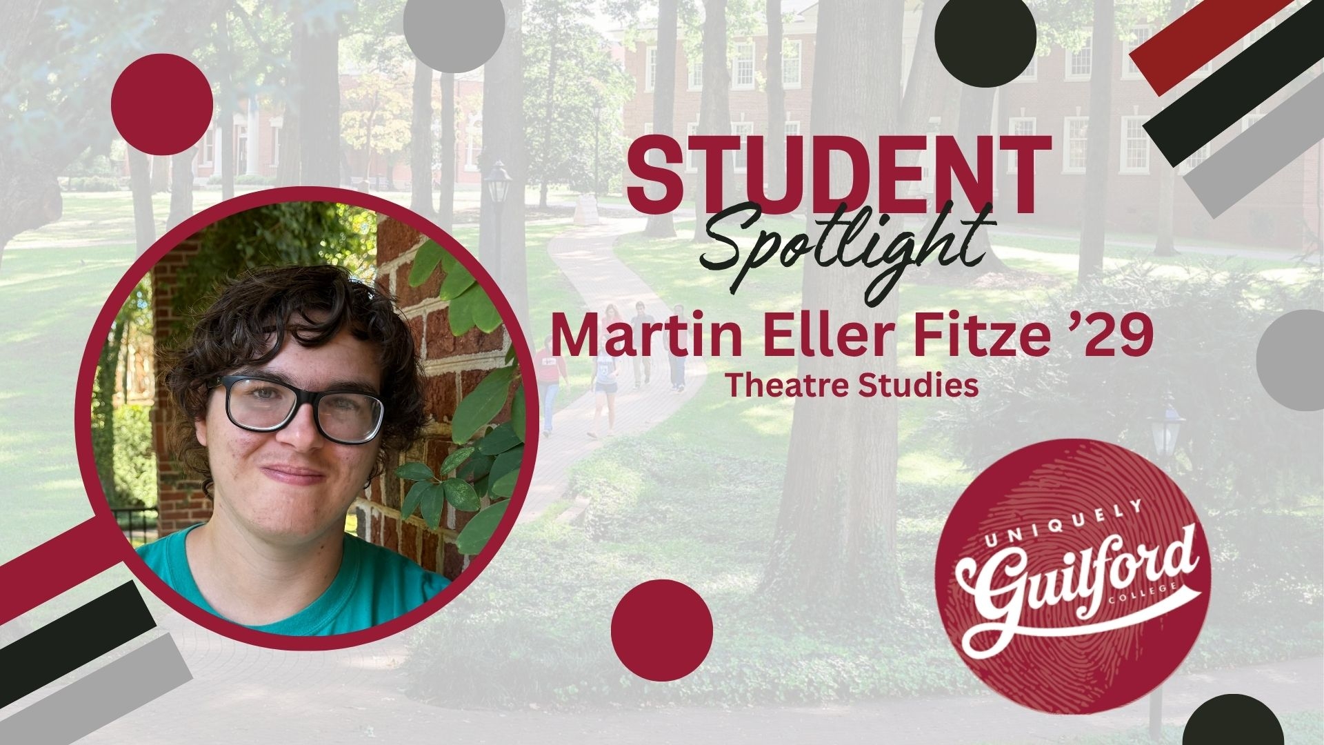 That search led him south to Guilford College, one of the nation’s few higher education institutions founded by the Religious Society of Friends. Now a first-year student majoring in Theatre Studies, Martin says the Quaker values that shape Guilford — simplicity, peace, integrity, community, equality and stewardship — were a big part of what drew him in.