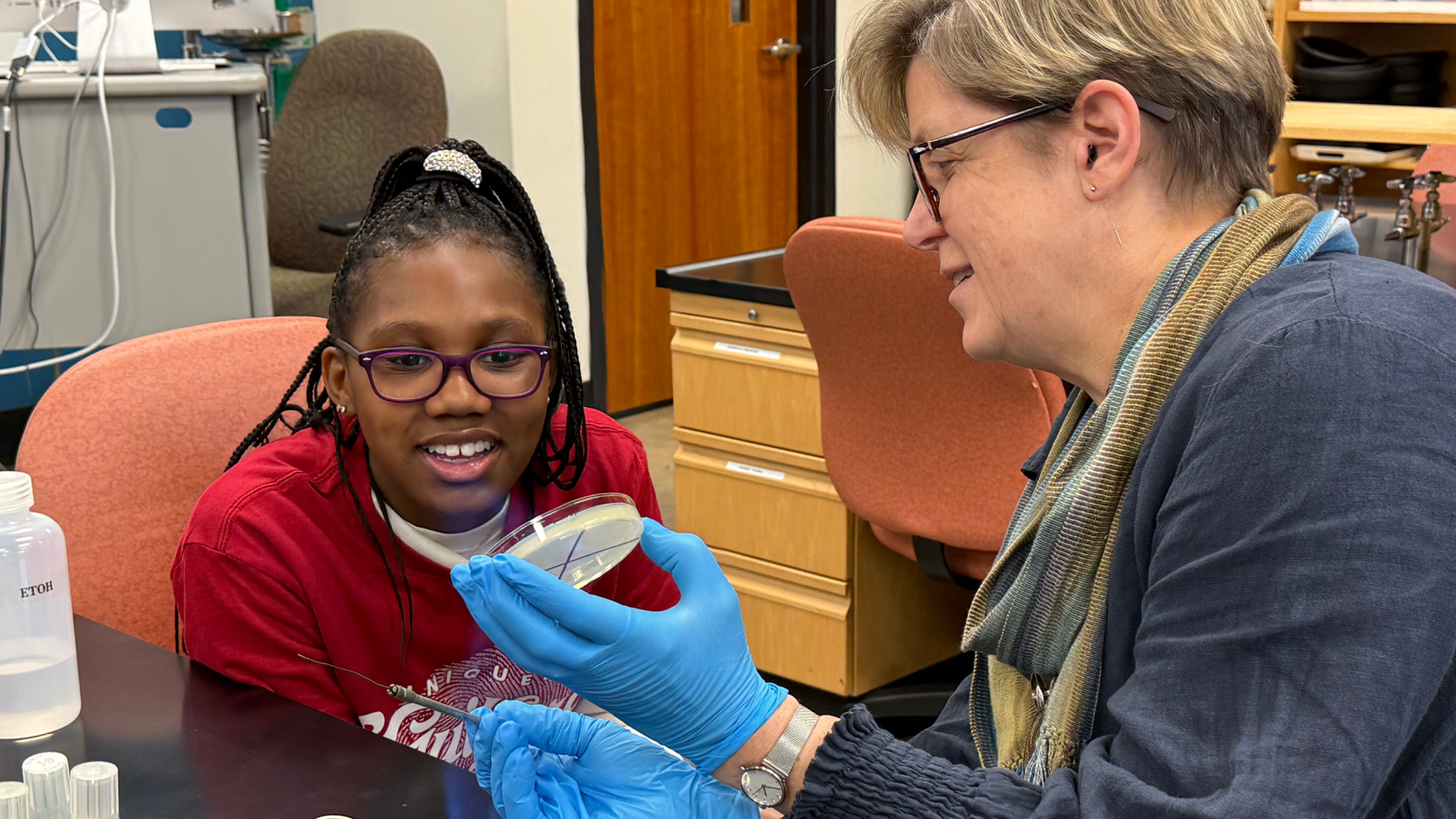 From there, she moved into biology labs in the Frank Family Science Center, where the scale shifted dramatically. She sat in on Assistant Professor of Biology Zandra Pinnix’s biology class with traditional-aged college students to learn more about fruit flies, small enough to overlook, complex enough to occupy entire fields of study.